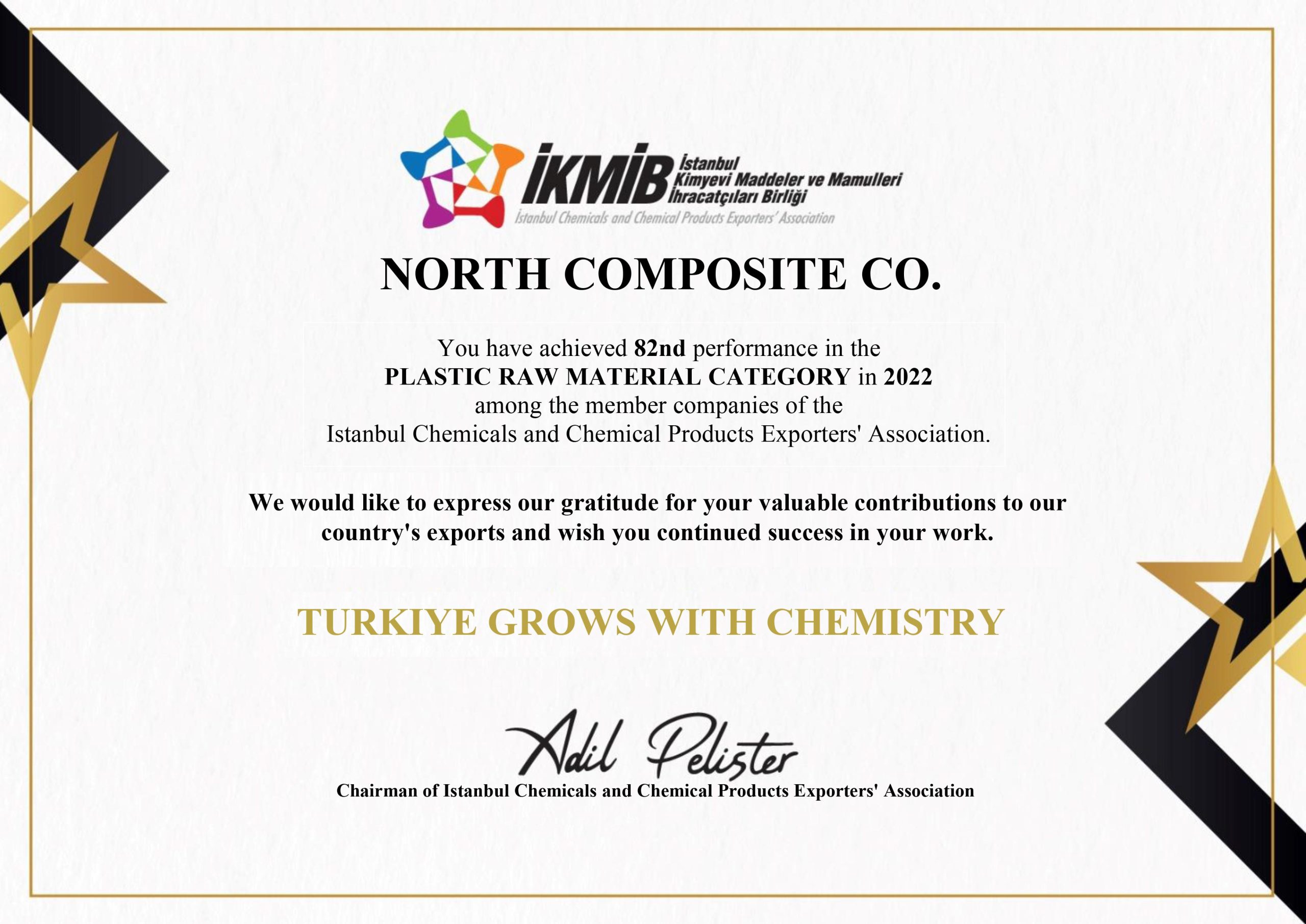 North Composite Co. ranked 82nd in the Plastic Raw Material Category in 2022 among member companies of the Istanbul Chemicals and Chemical Products Exporters’ Association (İKMİB). This achievement reflects our strong export performance and commitment to quality in global markets.